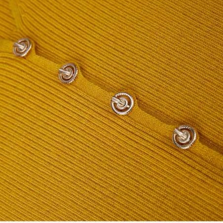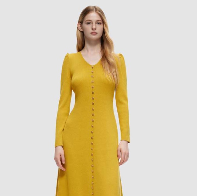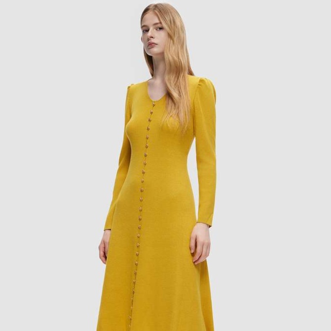 縦に連なる華やかな金属調のボタンが、シンプルなデザインのアクセントとして映える
