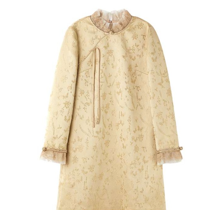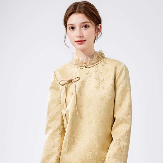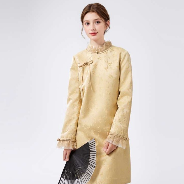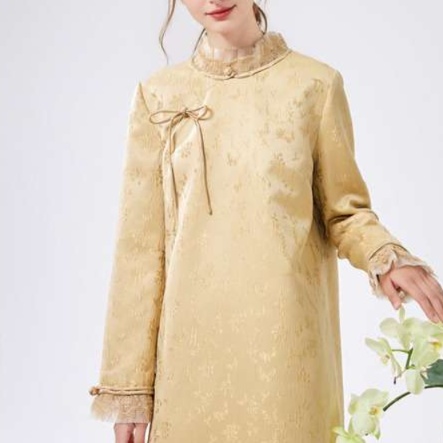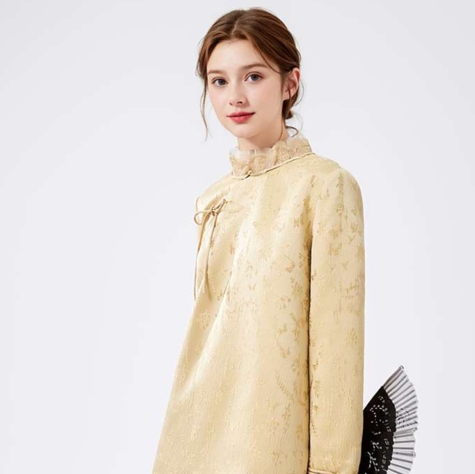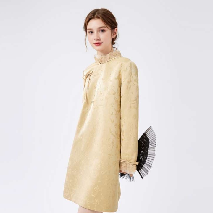 優雅な立ち衿とフリル装飾が魅力のチャイナ風チュニックワンピース。伝統的なスタイルをモダンにアレンジし、繊細な花柄の織り模様が上品さを引き立てる。袖口のフリルと胸元のリボンが女性らしさを添え、特別なシーンにもぴったりな一着。着心地も良く、デイリーユースからお出かけまで幅広く活躍するアイテム。