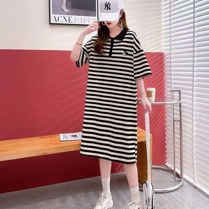 シンプルなストライプ柄のチュニックワンピース。ゆとりのあるシルエットで着心地抜群。 袖はゆったりとした五分丈で、春夏のカジュアルコーディネートにぴったり。 膝下丈でスニーカーとの相性も抜群なデイリーユースアイテム。