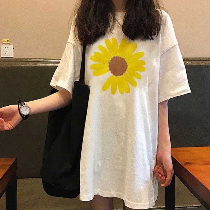 胸元のハートとひまわりのデザインが印象的で、カジュアルな着こなしにぴったり。