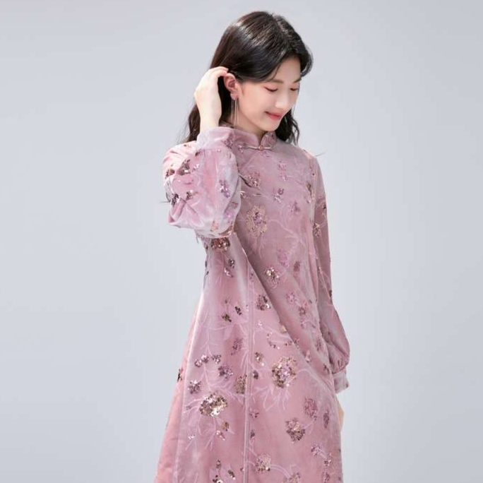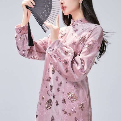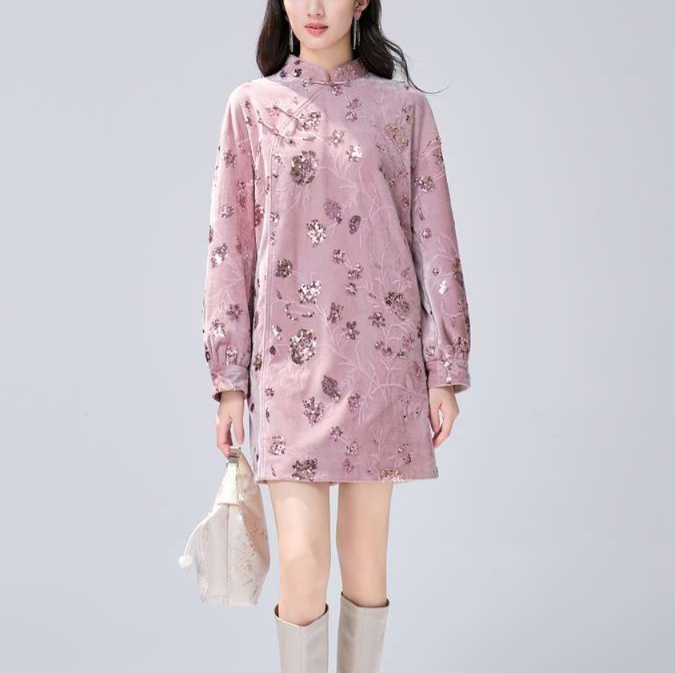 スタンドカラーと繊細な花柄が織りなす伝統的かつモダンな雰囲気を演出