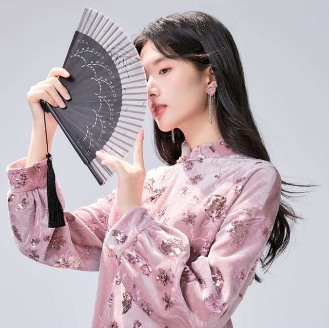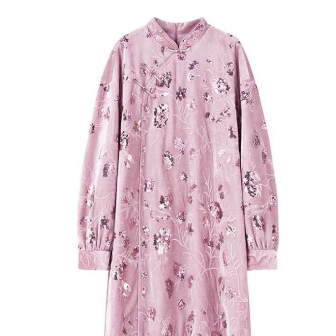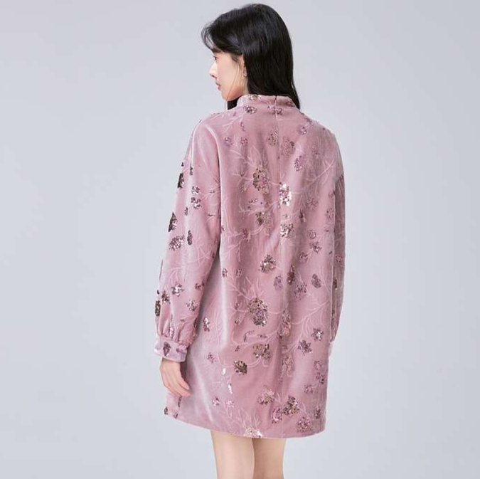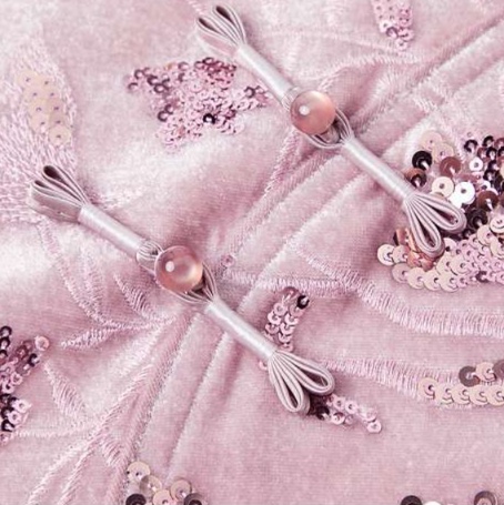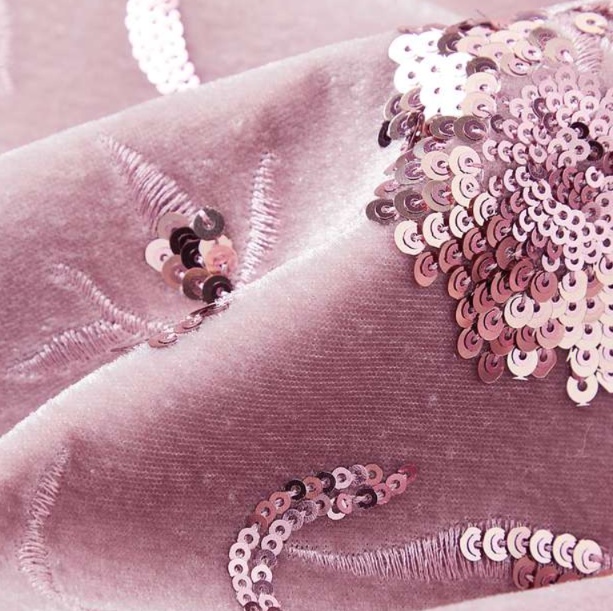 光沢のある生地に施されたスパンコール刺繍が華やかさと高級感を引き立てる