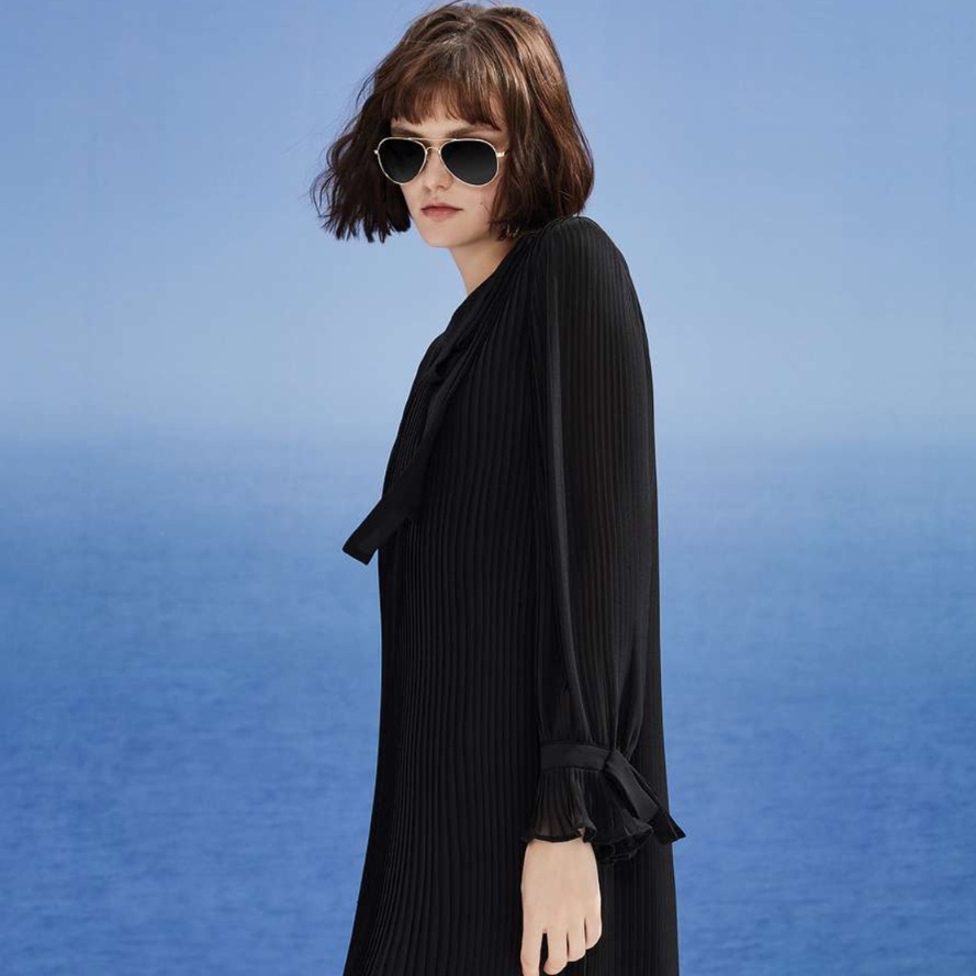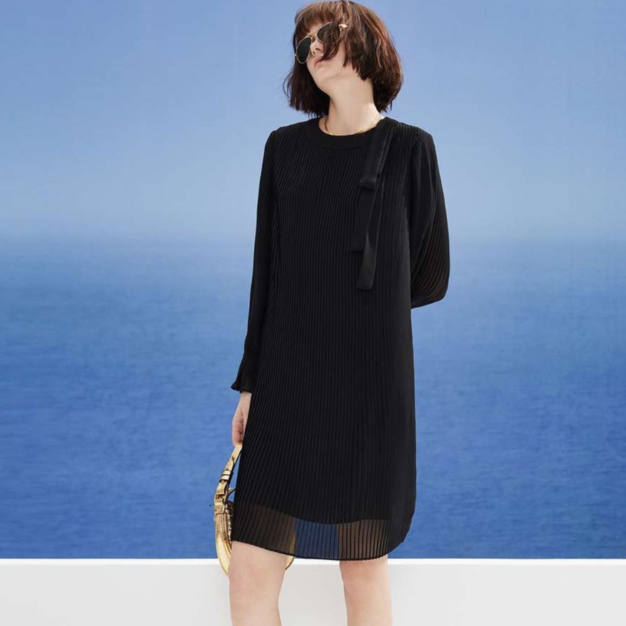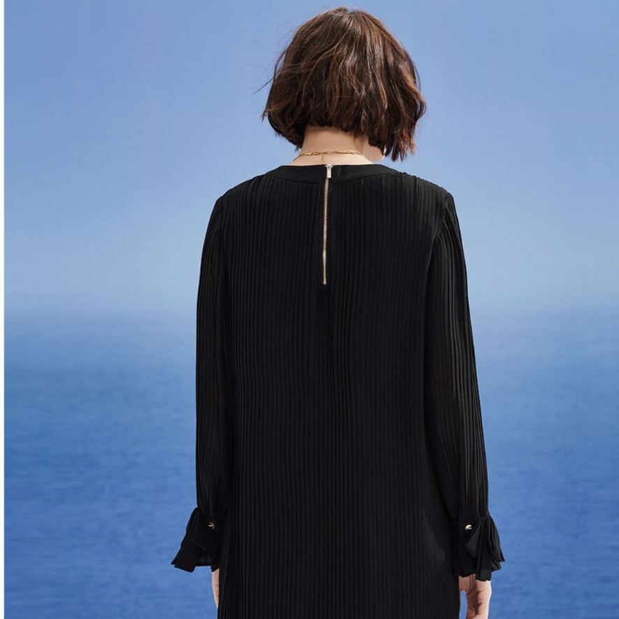 上品な細かいプリーツ加工が施されたチュニックスタイルのワンピース。後ろファスナー仕様で、後ろ姿も美しく魅せるデザイン。袖口のリボンディテールや透け感のある裾が、女性らしさを引き立てる一着。特別な日にも普段使いにもぴったりな、魅力あふれるアイテムです。
