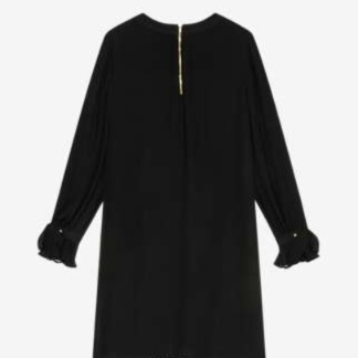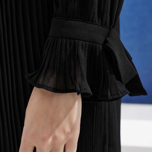 袖口のフリルデザインが、シンプルな黒ワンピースに女性らしい柔らかさを添える