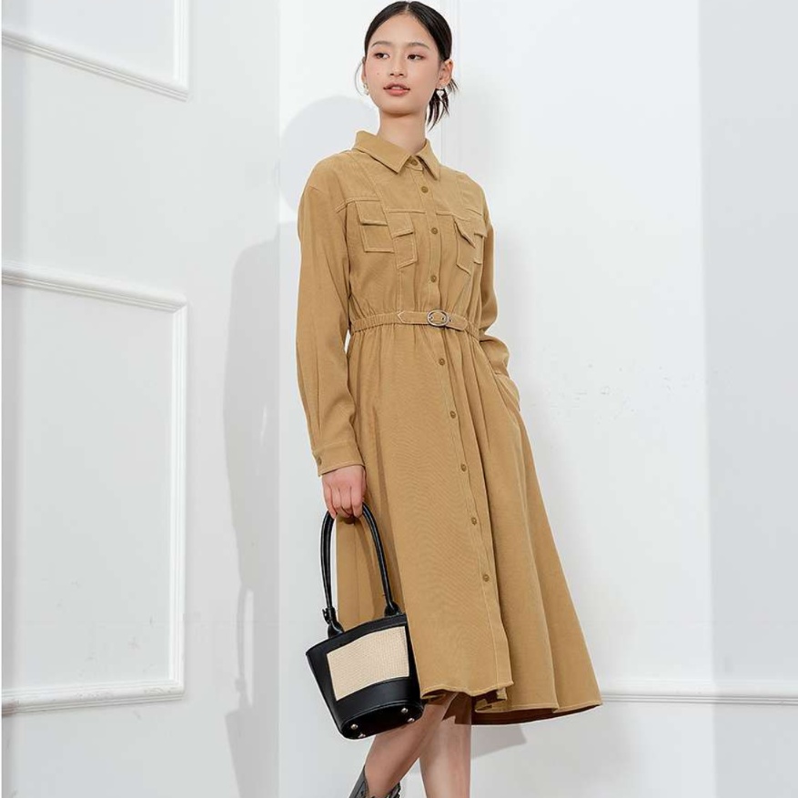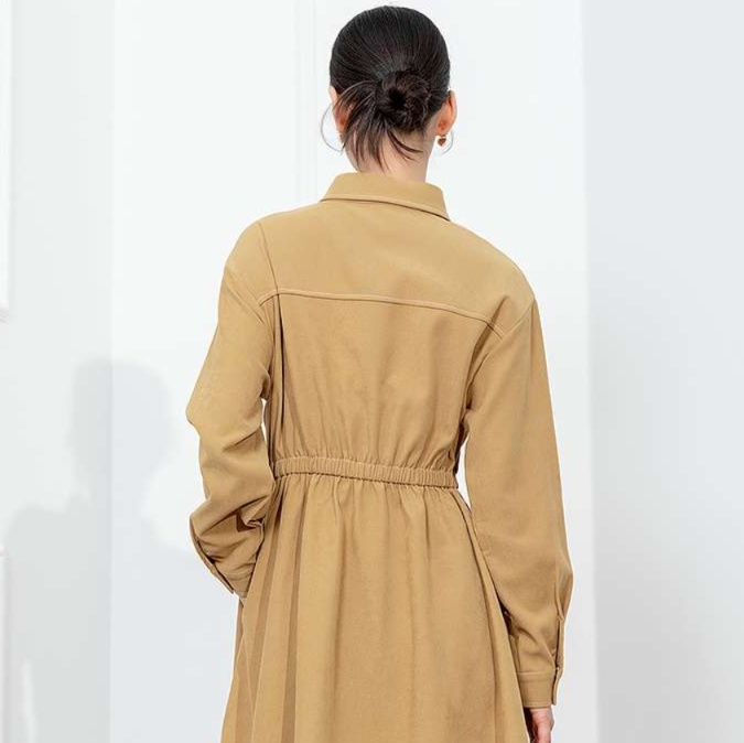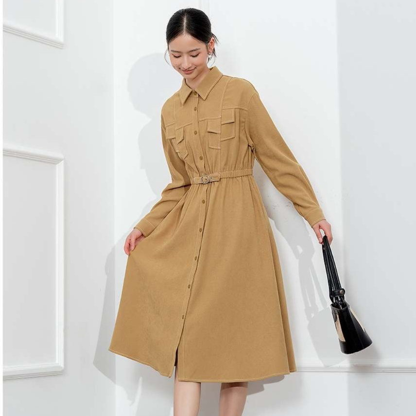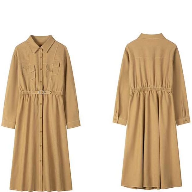 ベルトで引き締められたウエストラインが、すっきりとした美しいドレープを生み出す