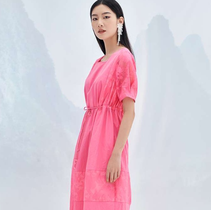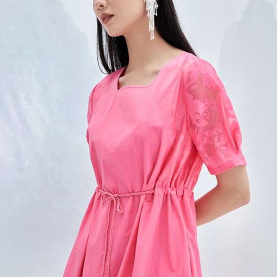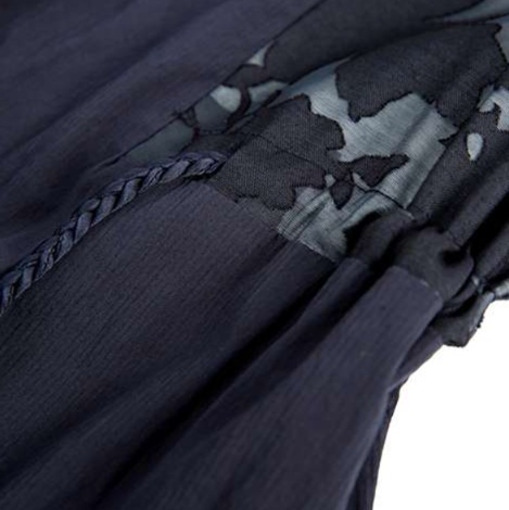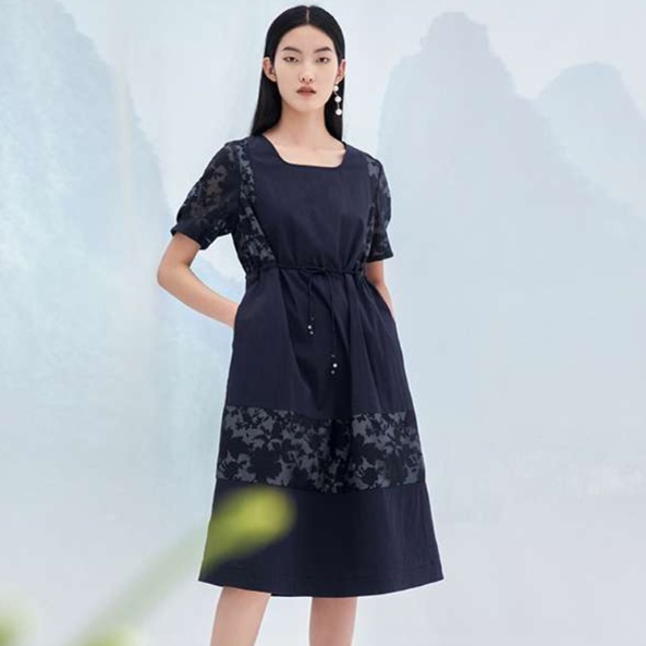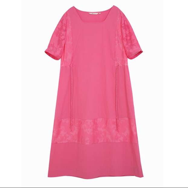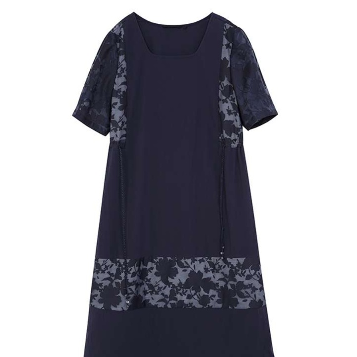 ウエストと裾に施された繊細な花柄パネルが、シンプルな中にも華やかさを添える