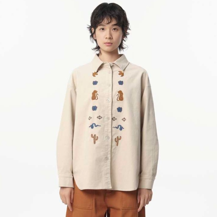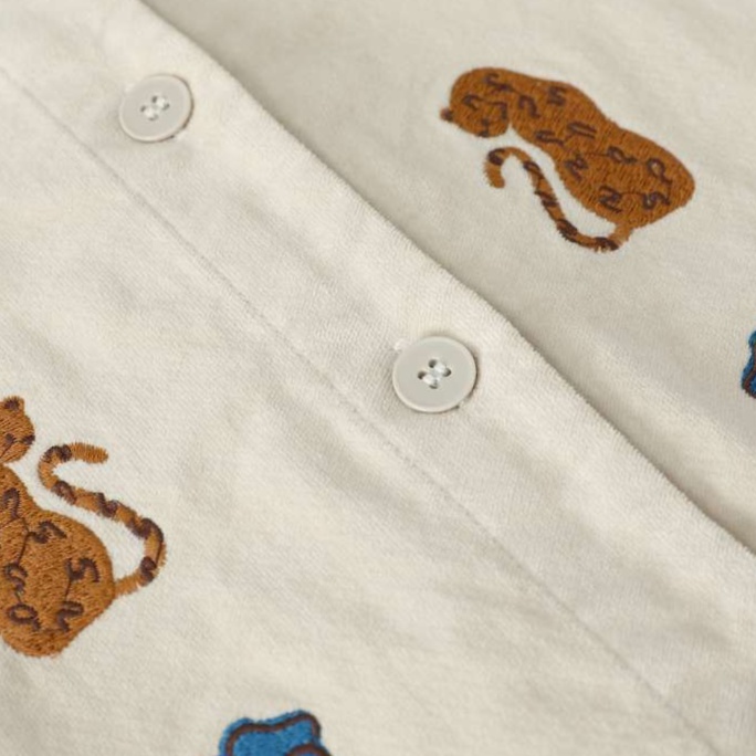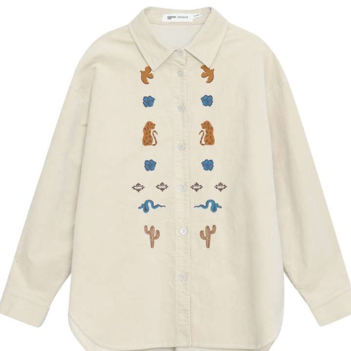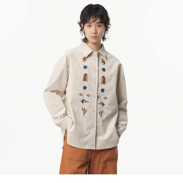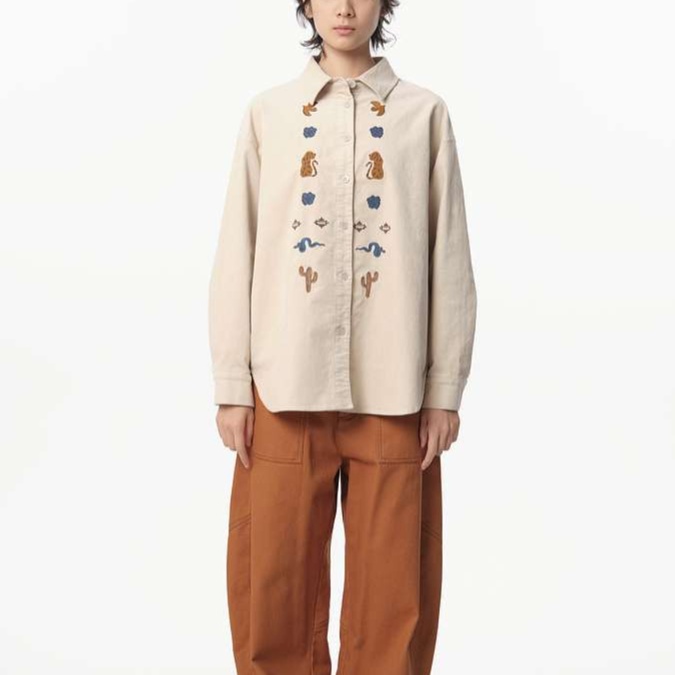 愛らしい動物モチーフの刺繍が施されたチュニック丈シャツ。すっきりとした襟元が魅力的で、サボテンや小花の遊び心あふれるデザインが印象的。ゆったりとしたシルエットはリラックスした着心地を提供し、カジュアルなコーディネートにもぴったり。普段使いからお出かけまで幅広く活躍する一枚。