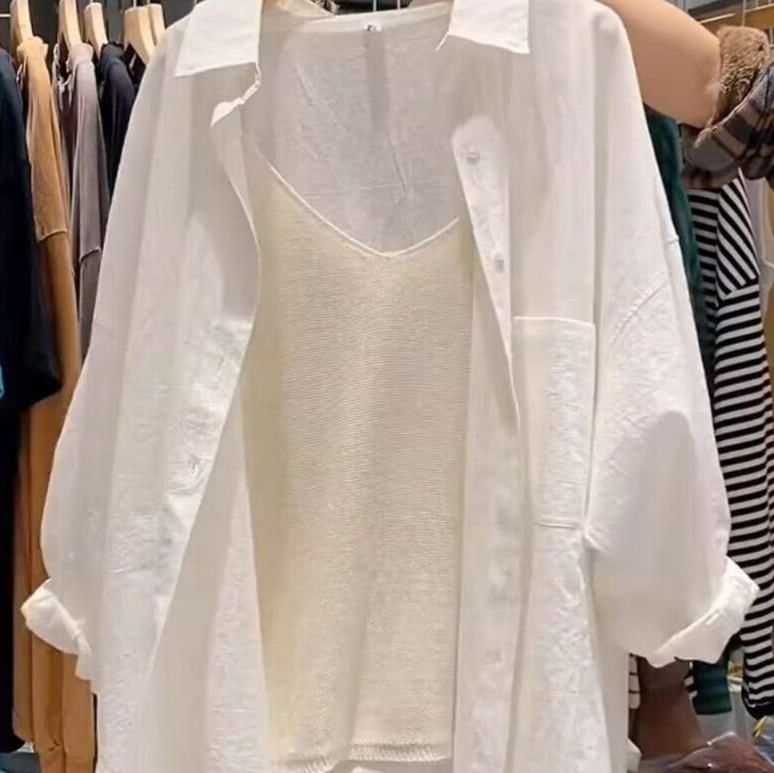 タンクトップとのレイヤードスタイルで抜け感を演出し、袖はロールアップ可能。
