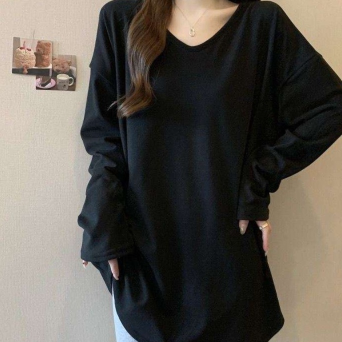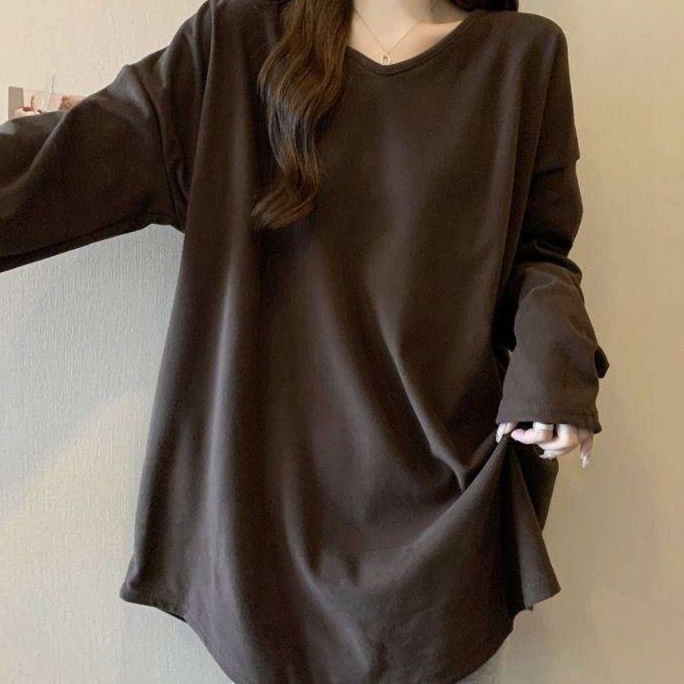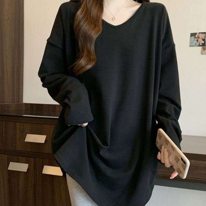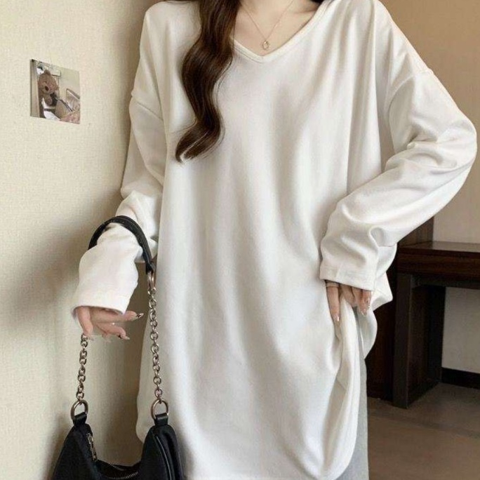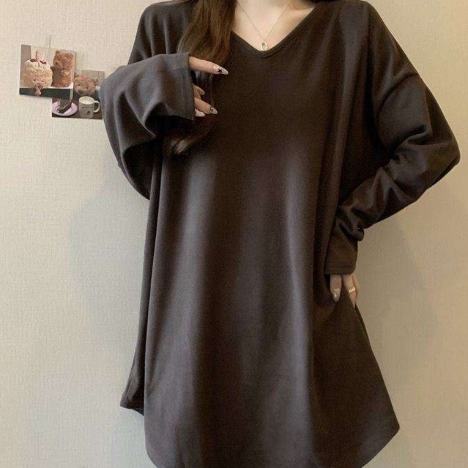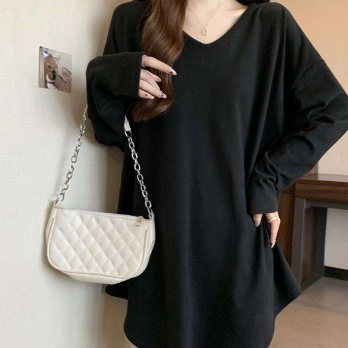 すっきりとしたVネックと程よい丈感で、大人っぽい洗練された印象を演出