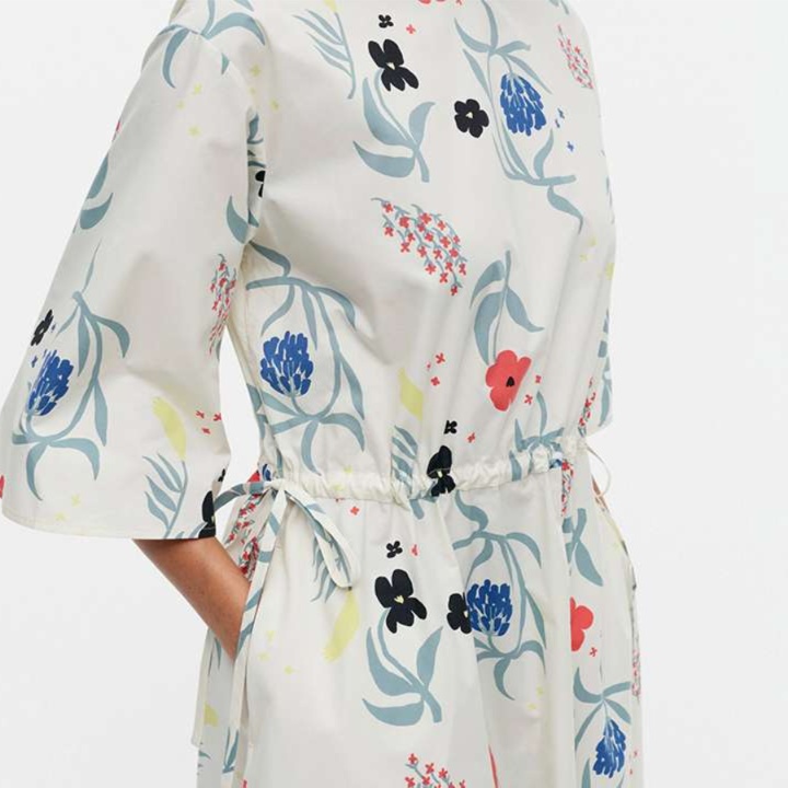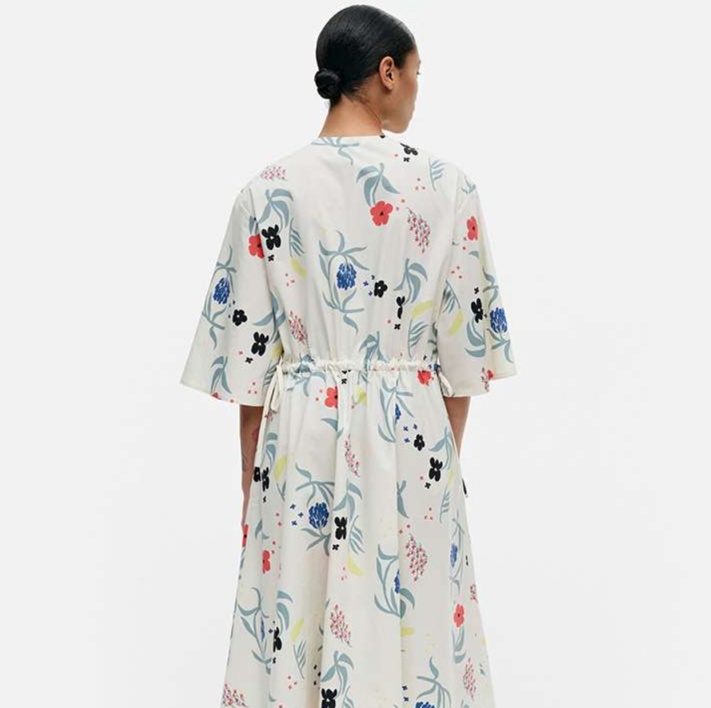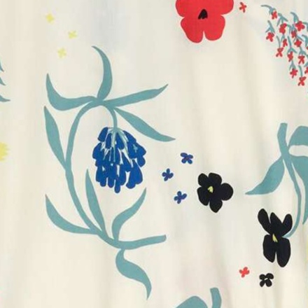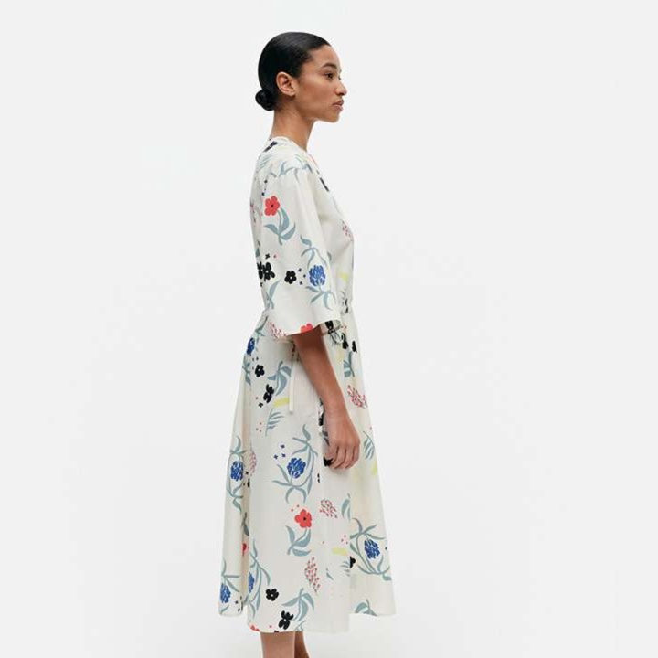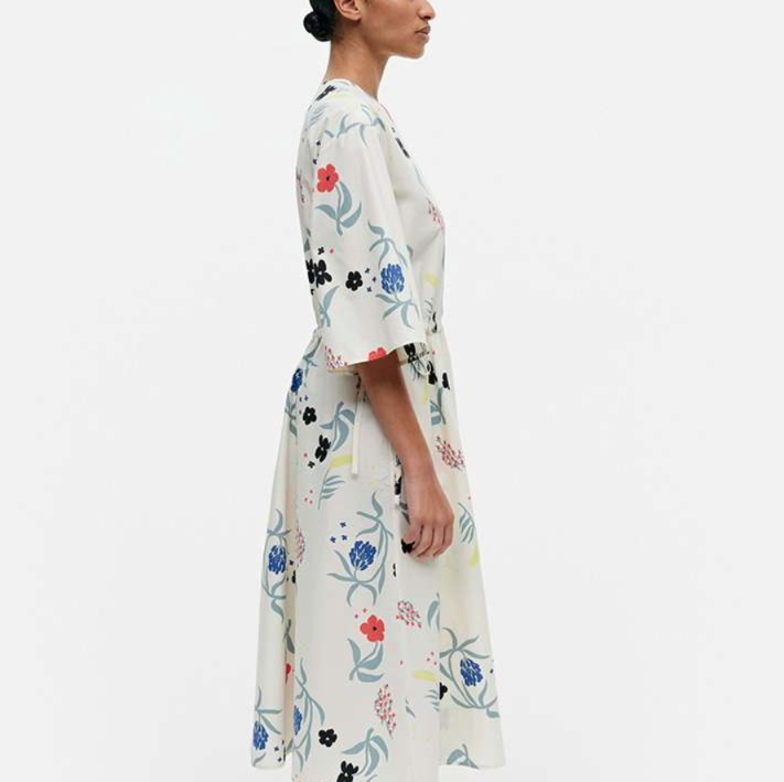 青や赤の花々が白地に優雅に配置され、清楚で大人っぽい雰囲気を演出